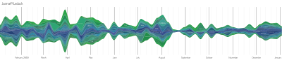 Personally, I don’t use the radio stations that often, but the site offers other benefits. The historical information allows for some powerful investigations of musical taste – and with three years of data and nearly 35,000 plays I have an impressive personal dataset. It’s all accessible through the last.fm API. This makes it possible to create really cool mashups, like LastGraph, which creates awesome visualizations of listening history: